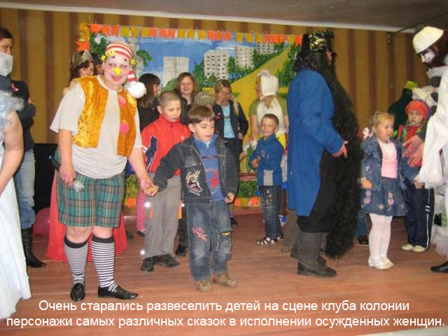 Какой праздник без сказочного спектакля? Подготовленный другими заключенными, по их же сценарию, он вызвал бурю радостных эмоций у малышей. Веселый Буратино и злой Карабас-Барабас, красавица Мальвина, другие персонажи проявили настоящий актерский талант у осужденных женщин. На сцене клуба чередовались танцы, творческие конкурсы, шуточные состязания. Счастливым малышам вручались подарки, их фотографировали на память.