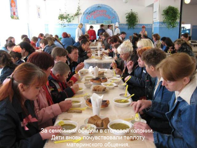 Во время праздничного обеда в столовой колонии женщины, забыв о себе, старались сытнее накормить своих деток после дальней дороги. Сложно описать радость, нежность давно не видевших друг друга родных людей.